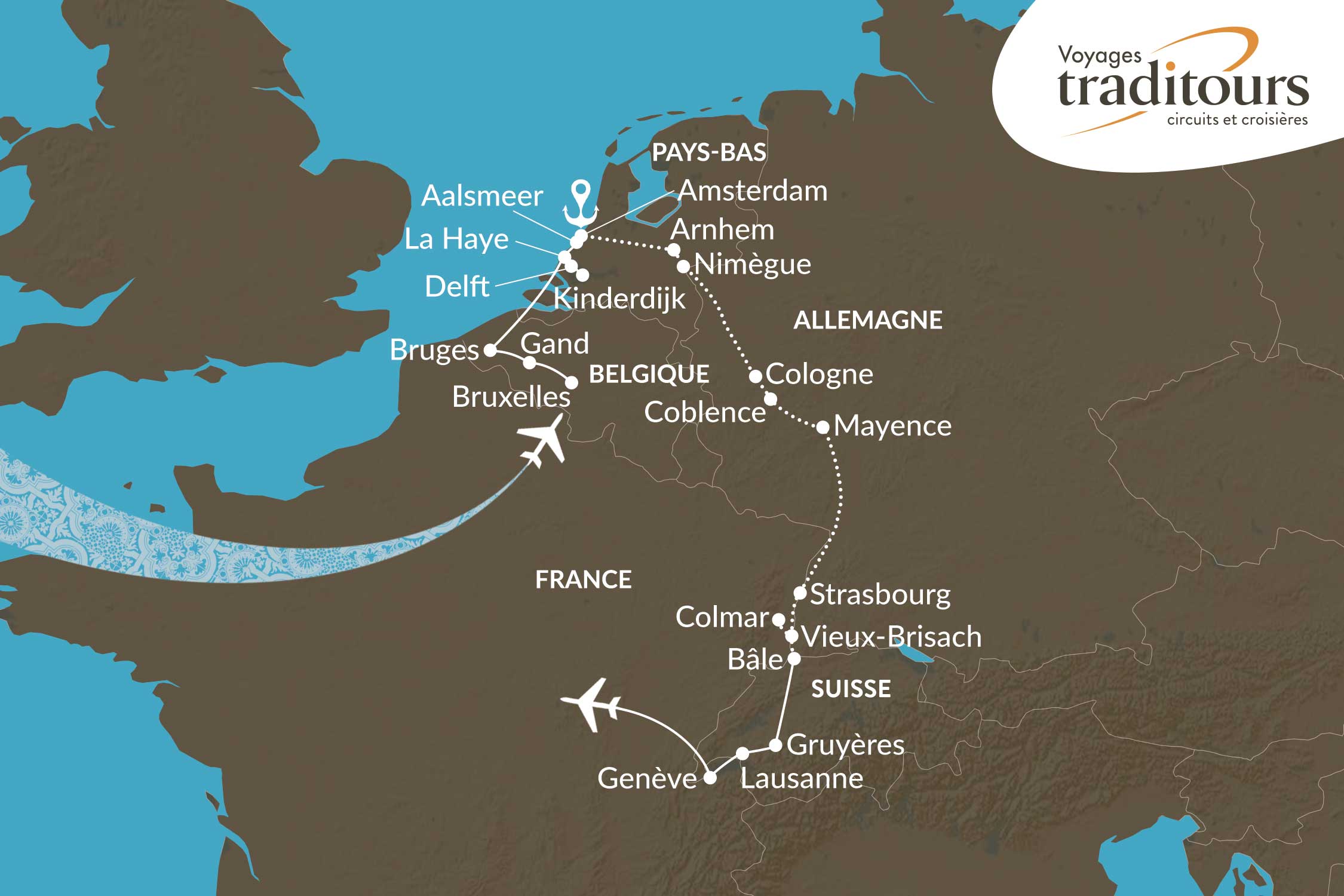 Ce nouveau circuit Croisière sur le Rhin répondait vraiment à notre souhait de visiter la Belgique et les Pays-Bas avec d'autres destinations en Allemagne et en Suisse. Les 8 premiers jours en circuit terrestre nous ont permis d'apprécier la Belgique et les Pays-Bas , autant l'histoire du chocolat belge, les balades à travers les canaux de vill...