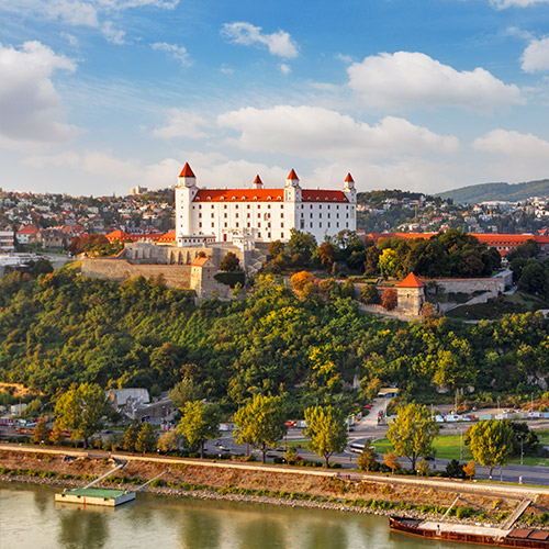 Déjeuner à bord. Poursuite de la navigation vers notre destination de la journée. Dîner à bord. Arrivée à Bratislava, la capitale slovaque, puis départ pour un tour panoramique qui nous mènera jusqu’au château de Bratislava (extérieurs). Détruit par un incendie en 1811, le château fut reconstruit au 20e siècle et offre une vue surprenante sur le Danube et la ville. La vieille ville abrite les principaux monuments historiques, que nous découvrirons lors d’une visite à pied, permettant d’apprécier tout son charme. Nous passerons par la porte médiévale Saint-Michel, monument emblématique de la ville. Puis nous rejoindrons la place centrale, bordée de bâtiments élégants et dominée par le vieil hôtel de ville, qui présente une fascinante mosaïque de styles variés. Poursuite par le palais primatial (vue extérieure), de style classique, achevé en 1781 pour l’archevêque Jozef Bathyány. Temps libre, puis retour au bateau. Souper à bord et soirée de gala. Navigation vers Vienne.