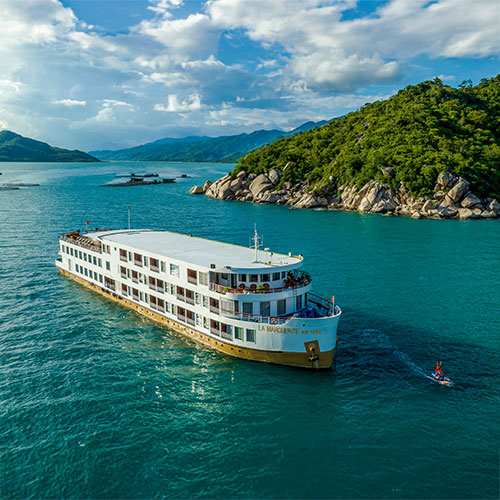 Le R/V La Marguerite est un navire moderne, offrant un confort optimal, dont l’intérieur allie subtilement les matériaux contemporains et locaux. Il est le premier navire d’une série de bateaux de croisière haut de gamme, spécialement conçu pour naviguer sur le Mékong entre Ho Chi Minh-ville et Siem Reap. Vous pourrez retrouver plusieurs commodités à bord, tels que la climatisation sur l’ensemble du navire, le salon avec grandes baies vitrées, le restaurant, le grand lounge bar avec une vue panoramique 360° et le pont soleil aménagé. Les 46 cabines sont réparties sur 4 ponts. 5 roses des vents - Inauguré en 2014 — Capacité : 92 passagers