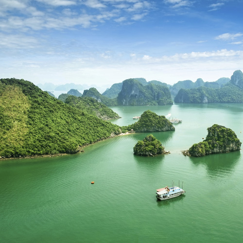 Déjeuner. Route en direction de la baie d’Ha Long, inscrite au patrimoine de l’humanité depuis 1994. Dès notre arrivée, embarquement à bord de notre jonque afin de profiter du paysage magnifique qui nous entoure. Cocktail de bienvenue et installation dans nos cabines. Dîner et départ en bateau vers la grotte Luon et visite de l’île Ti Top. Retour à bord de notre jonque pour le souper. Nuit à bord.