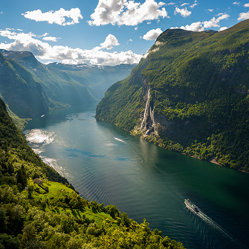 À l’extrémité du fjord de Geiranger (une branche du grand Storfjorden via le Sunnylvsfjord), le village de Geiranger offre l’un des panoramas les plus spectaculaires de Norvège et figure parmi les destinations incontournables du pays.