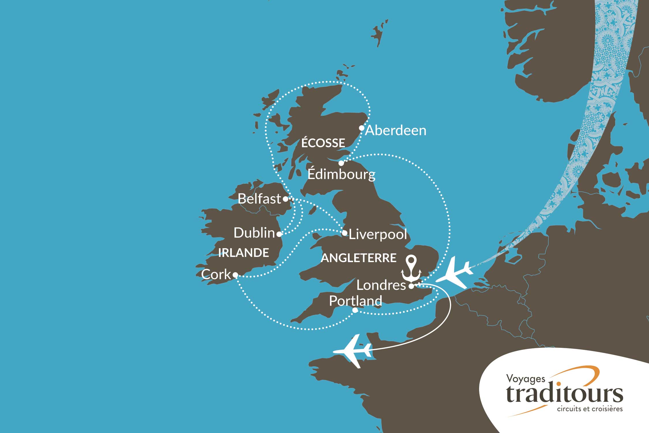 NOTES : Ce programme a été établi longtemps à l’avance en fonction des impératifs locaux connus. Des modifications peuvent donc survenir en raison de divers facteurs opérationnels, logistiques ou toute autre raison hors du contrôle de Voyages Traditours. Les compagnies de croisière se réservent le droit d’ajuster l’ordre des escales, de remplacer une destination ou d'adapter la durée des arrêts en fonction notamment des conditions de navigation et météorologiques. Ces changements peuvent être nécessaires en fonction des exigences portuaires, des décisions des armateurs ou d’autres impératifs jugés essentiels au bon déroulement du voyage. Voyages Traditours se réserve aussi le droit d’apporter des ajustements au programme, afin de garantir la meilleure expérience possible