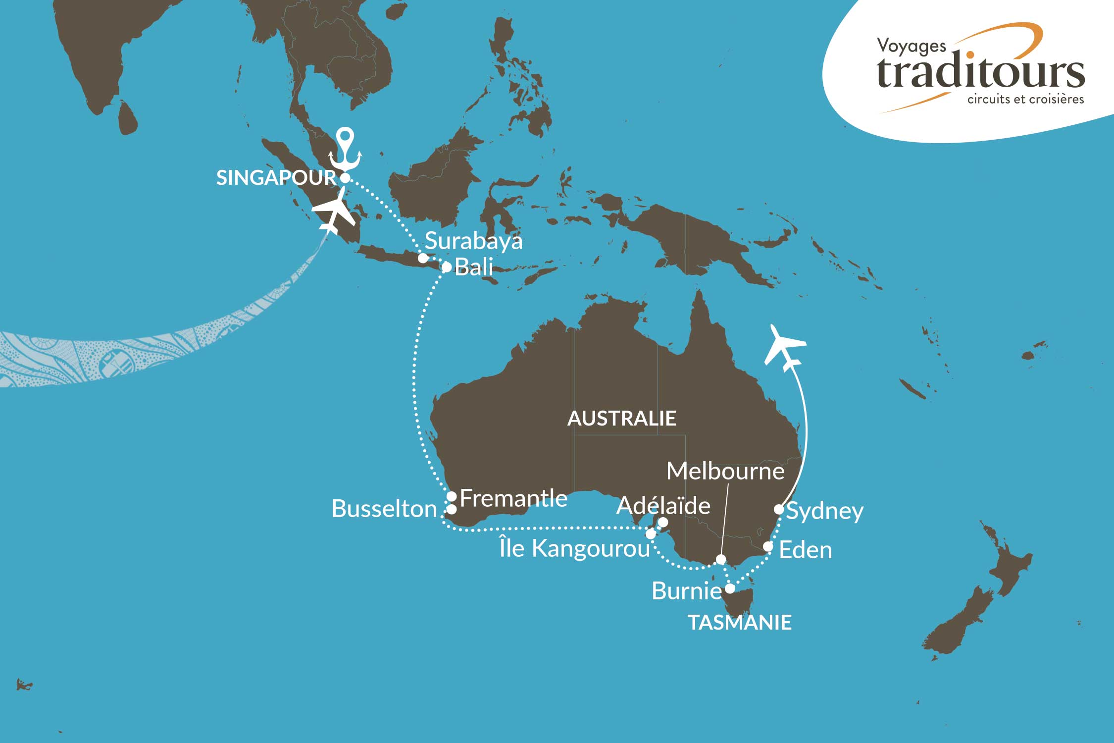 Incluant 1 nuit et un tour de ville à Singapour et Sydney
