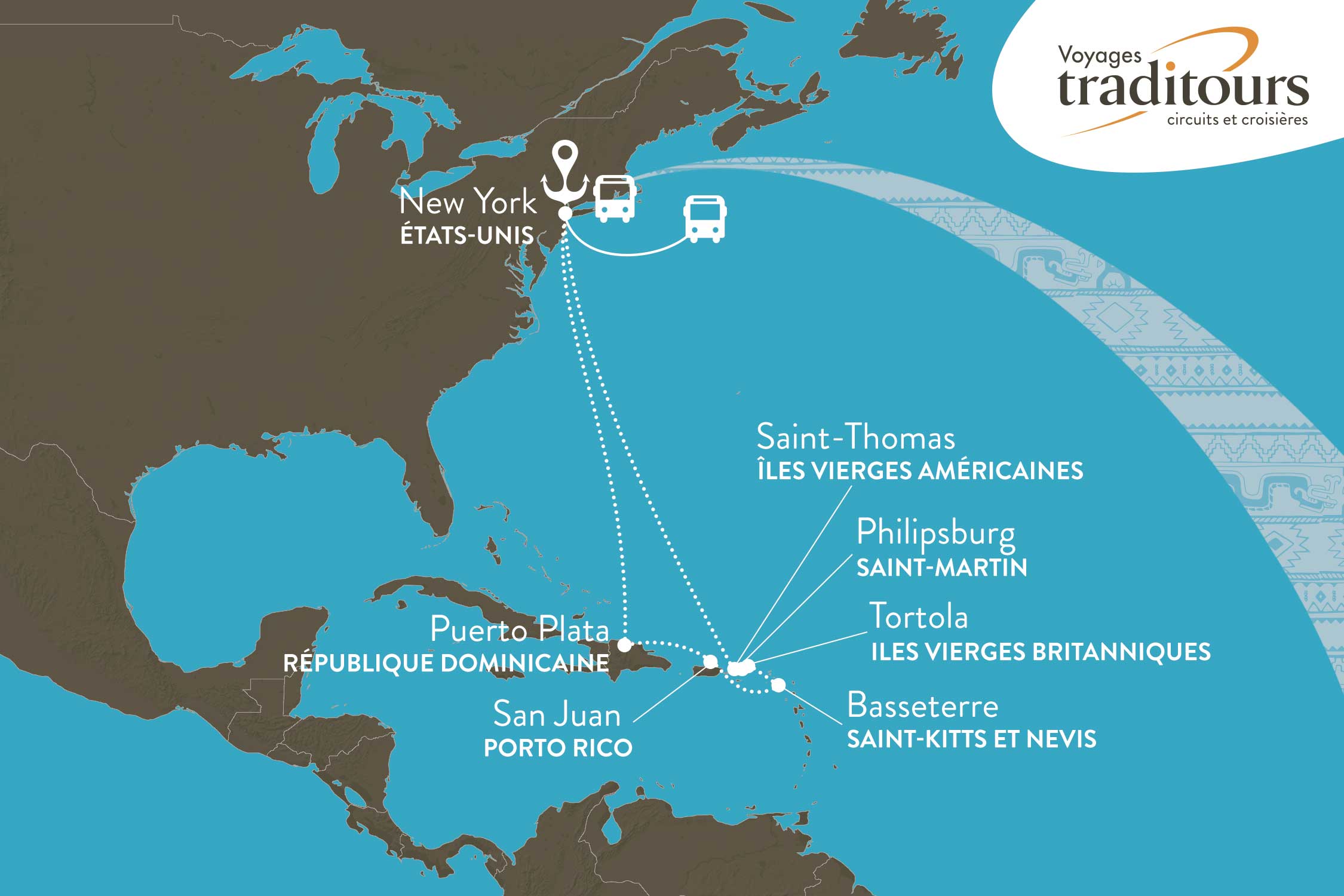 NOTES : Ce programme a été établi longtemps à l’avance en fonction des impératifs locaux connus. Des modifications peuvent donc survenir en raison de divers facteurs opérationnels, logistiques ou toute autre raison hors du contrôle de Voyages Traditours. Les compagnies de croisière se réservent le droit d’ajuster l’ordre des escales, de remplacer une destination ou d'adapter la durée des arrêts en fonction notamment des conditions de navigation et météorologiques. Ces changements peuvent être nécessaires en fonction des exigences portuaires, des décisions des armateurs ou d’autres impératifs jugés essentiels au bon déroulement du voyage. Voyages Traditours se réserve aussi le droit d’apporter des ajustements au programme, afin de garantir la meilleure expérience possible.