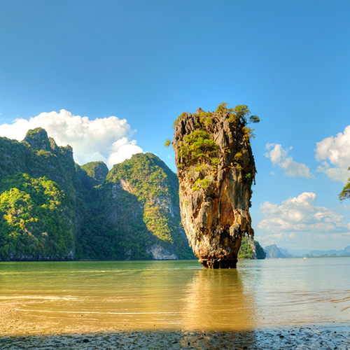 Nous découvrirons la fabuleuse baie de Phang Nga, un lieu extraordinaire. Elle forme un réseau complexe de deltas, d’épaisses mangroves et de palmiers nipa qui se développent jusque dans la mer. Le littoral est protégé par une succession de pitons calcaires et autres pics rocheux aux formes artistiques se dressant jusqu’à une hauteur de 300 m, telle une armée de pierres monolithiques. Notre visite s’effectuera en bateau de manière à pouvoir explorer les mystères de la mangrove et profiter d’une vue panoramique spectaculaire des collines calcaires recouvertes par la jungle. Nous débuterons la visite par un des fameux villages sur pilotis qui peuvent accueillir jusqu’à 500 familles au pied de la montagne. Dîner. La beauté naturelle de cette baie nous coupera le souffle avec ses cavernes et criques bordées de plages tropicales idylliques. De plus, nous ferons escale sur l’île de Ko Ping Kan, plus connue sous le nom de James Bond Island, car c’est là qu’une partie du film James Bond « l’homme au pistolet d’or » a été tournée. Nuit à quai.
