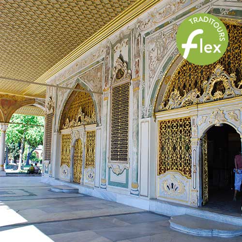 Déjeuner. Matinée et dîner libres pour nous permettre de découvrir le centre historique à notre rythme. L'après-midi, départ pour la visite du palais de Topkapi, résidence des sultans ottomans et des dames du harem pendant 400 ans. Nous serons subjugués par ses collections d’objets d’art, ses somptueux appartements, et ne manquerons pas de visiter le harem, dédale de superbes logements, où vivaient les concubines du sultan. Nous traverserons la place de l’Hippodrome et visiterons la mosquée bleue. Célèbre dans le monde entier, elle a été construite entre 1609 et 1616 par Ahmet 1er et domine de ses six élégants minarets la place Sultanahmet. Souper. Nuit à Istanbul.