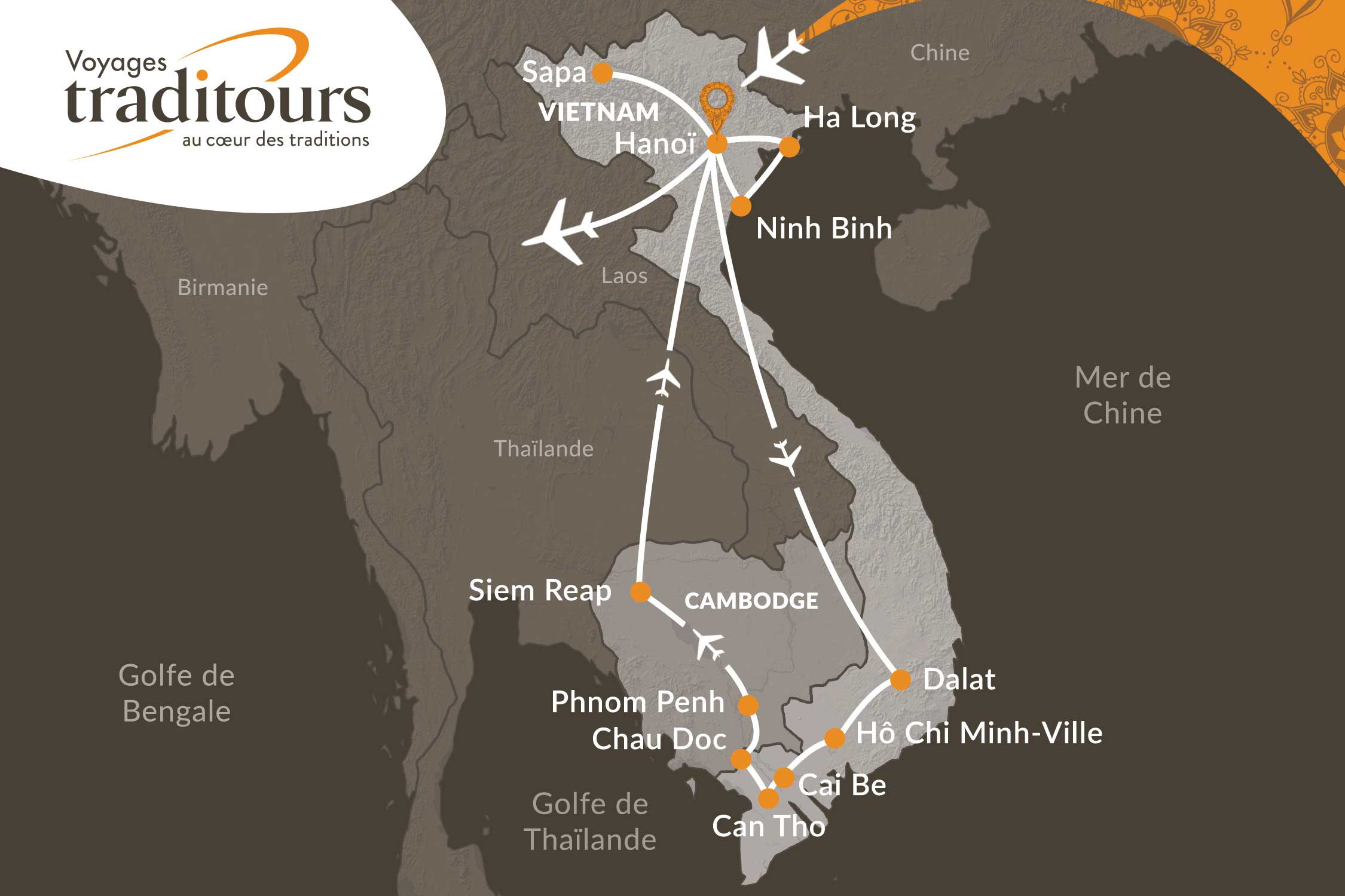 - Les 2 vols intérieurs : Hanoï / Dalat et Phnom Penh / Siem Reap