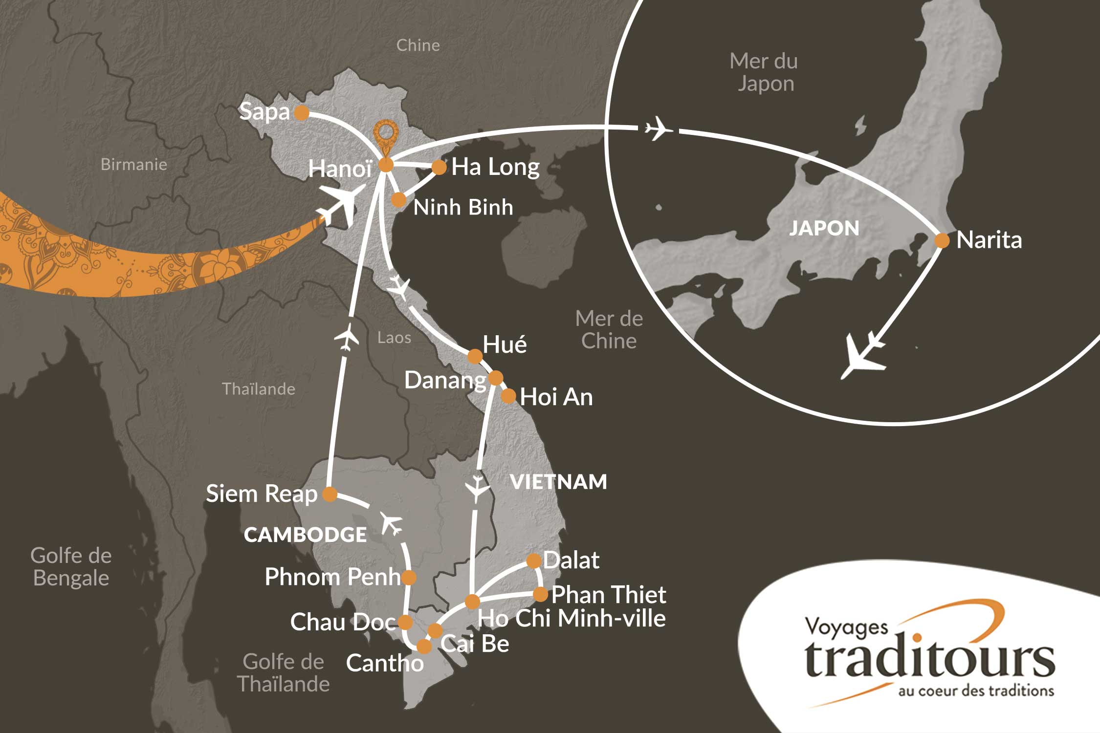 - Les 3 vols intérieurs : Hanoï / Hué, Danang / Hô Chi Minh-Ville & Phnom Penh / Siem Reap